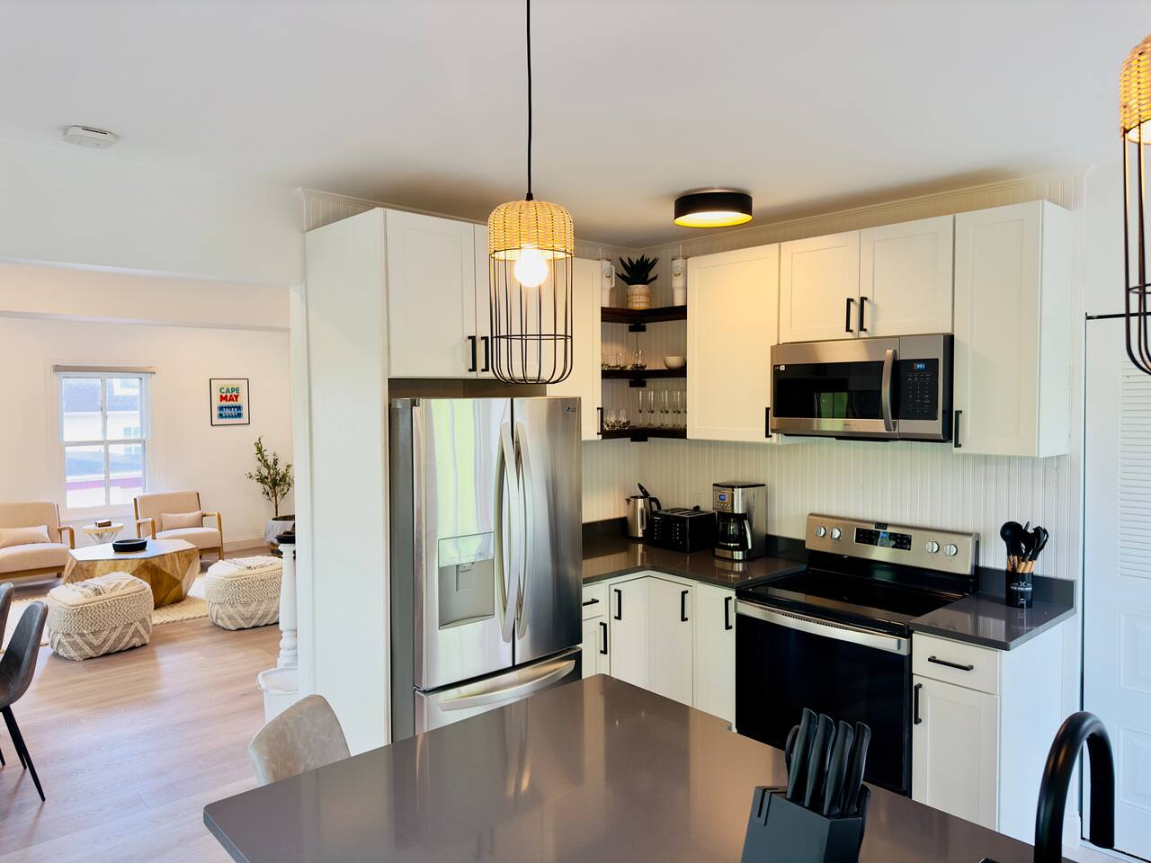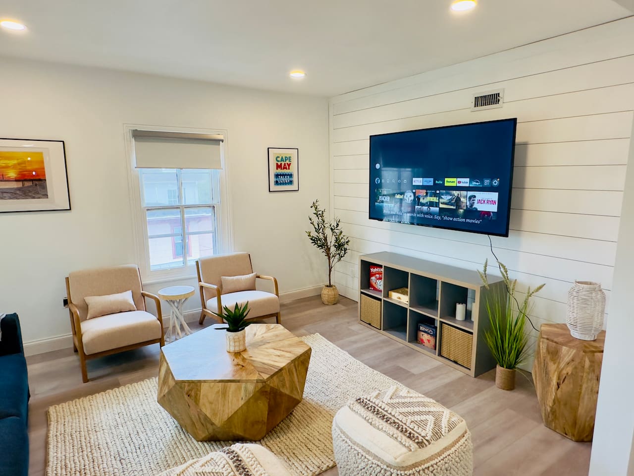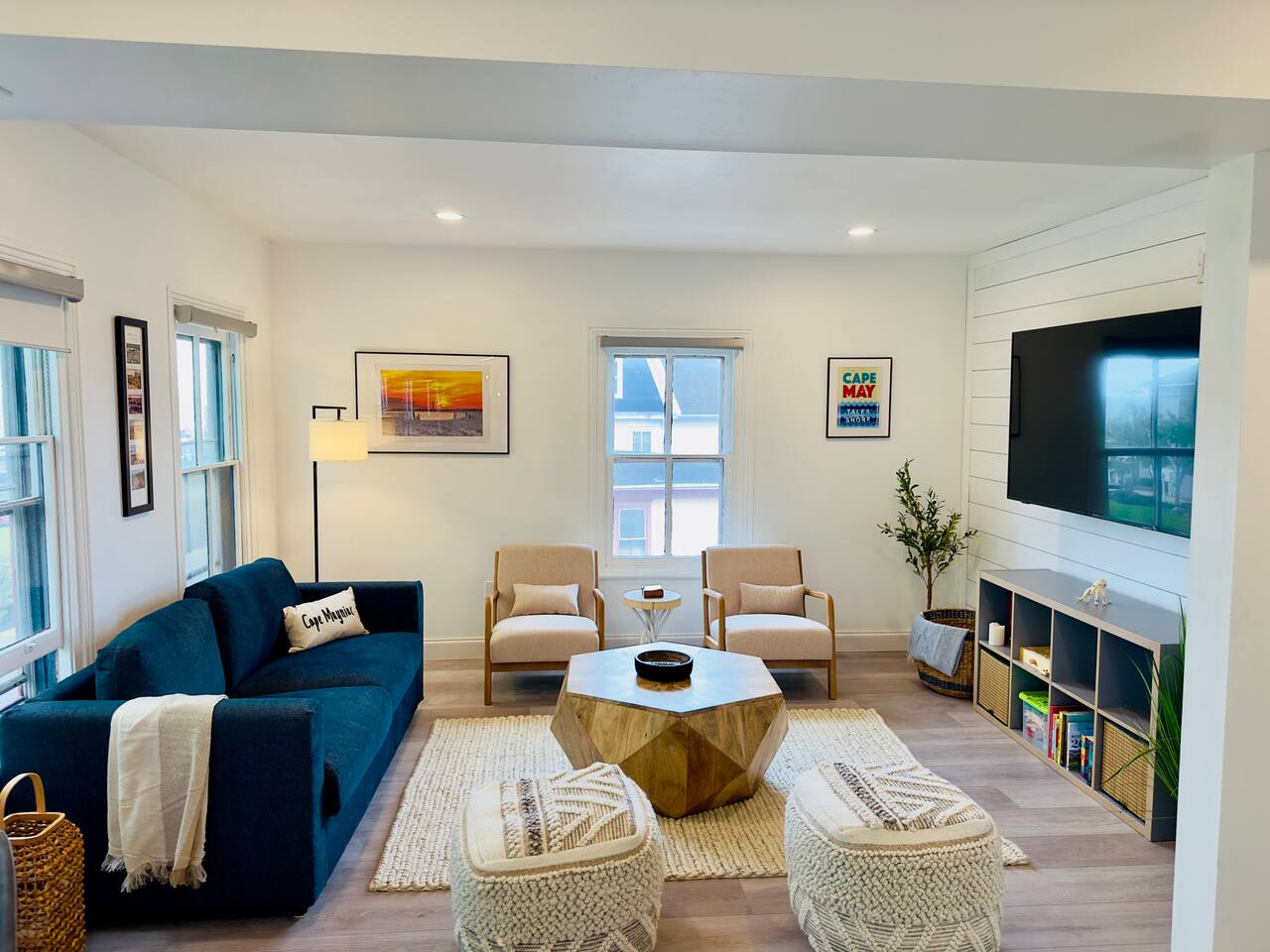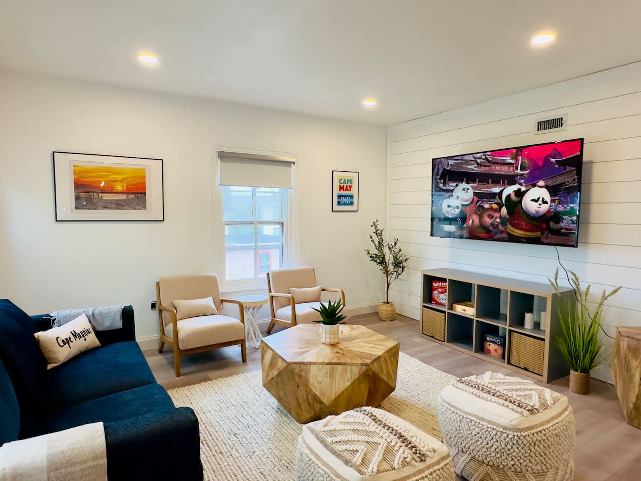 ☆☆ HIGHLIGHTS ☆☆ ✹ 2 spacious bedrooms; including a master suite with en-suite bathroom ✹ 2 full bathrooms ✹ Open-plan living area with large windows capturing ocean and town views ✹ Modern kitchen with high-end appliances and a 4-seater island ✹ Dining area adjacent to kitchen with ample seating ✹ Unique cupola with panoramic views and lounge chairs – perfect for sunset & wave watching ✹ Smart TVs in every room with access to Netflix, Amazon Prime, Disney+, and more ✹ 4 Complimentary beach passes and essential beach gear (only during the season, ie until mid September) ✹ Dedicated off-street parking and additional street parking ✹ Shared porch with traditional rocker chairs ✹ Fast Wi-Fi throughout the condo Guest Access: Entire condo is yours to enjoy, ensuring a private and uninterrupted experience. Keyless entry allows for a smooth self-check-in. Outdoor Space: Revel in the shared outdoor porch equipped with rocking chairs, ideal for relaxing and soaking in the coastal atmosphere. Activities/Attractions: Explore Cape May’s historic district, enjoy boutique shopping, or spend your days sunbathing and swimming at the beach. Don’t miss the local cuisine and the vibrant nightlife, all within walking distance! ★★ Book Today & Experience Cape May in Style! ★★ Other Things to Note: Ideal for up to 6 adults and 2 children. Check-in between 4 PM and 10 PM; Check-out at 10 AM. Embark on a vacation where the sea meets comfort and style. Reserve your stay at Cape Belvedere for a truly spectacular escape!